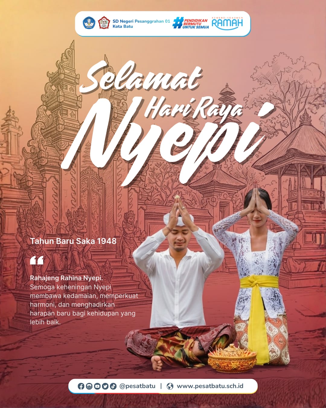 Kami segenap keluarga besar SDN Pesanggrahan 01 Batu mengucapkan “Selamat Hari Suci Nyepi Tahun Baru Saka 1948, Vasudhaiva Kutumbakam, Satu Bumi Satu Keluarga, wujudkan Batu Sae menuju Indonesia Maju”.